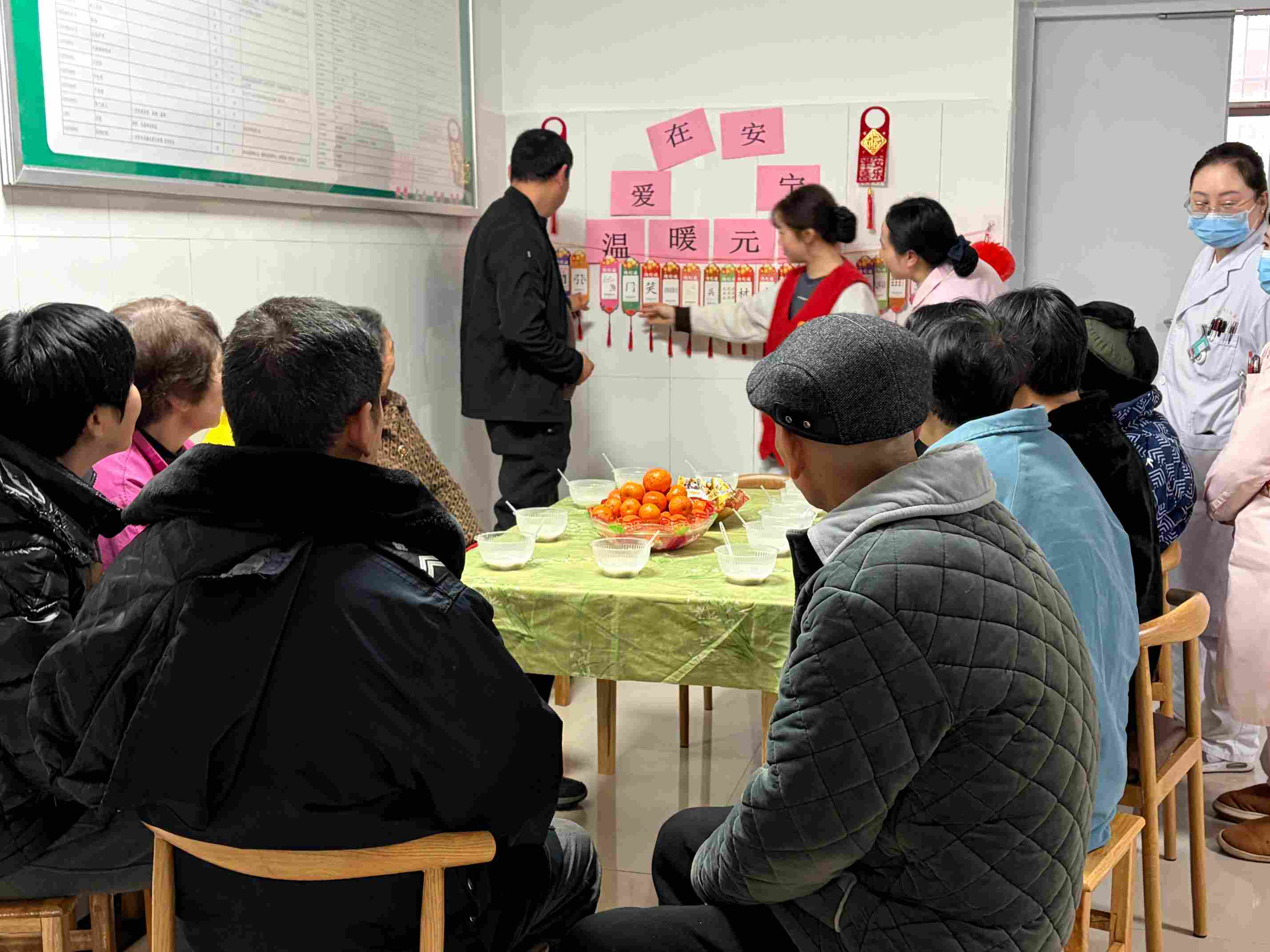 活动现场暖意融融,医护人员与患者、家属、党员志愿者等十余人围坐在一起,共庆佳节。桌上,寓意“大吉大利”的砂糖橘、香甜软糯的汤圆和各式糖果,营造出浓厚的节日氛围。大家一边品尝着甜蜜的食物,一边兴致勃勃地参与到猜灯谜的环节中。志愿者们手持灯谜条,用温和亲切的语气为大家解读,患者们或低头凝神思索,或与家属轻声细语地讨论,每当谜底揭晓,总会引来恍然大悟的欢笑。一时间,原本安静的病房里,洋溢着久违的欢声笑语,温暖的节日气息驱散了冬日的寒意。